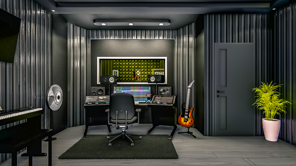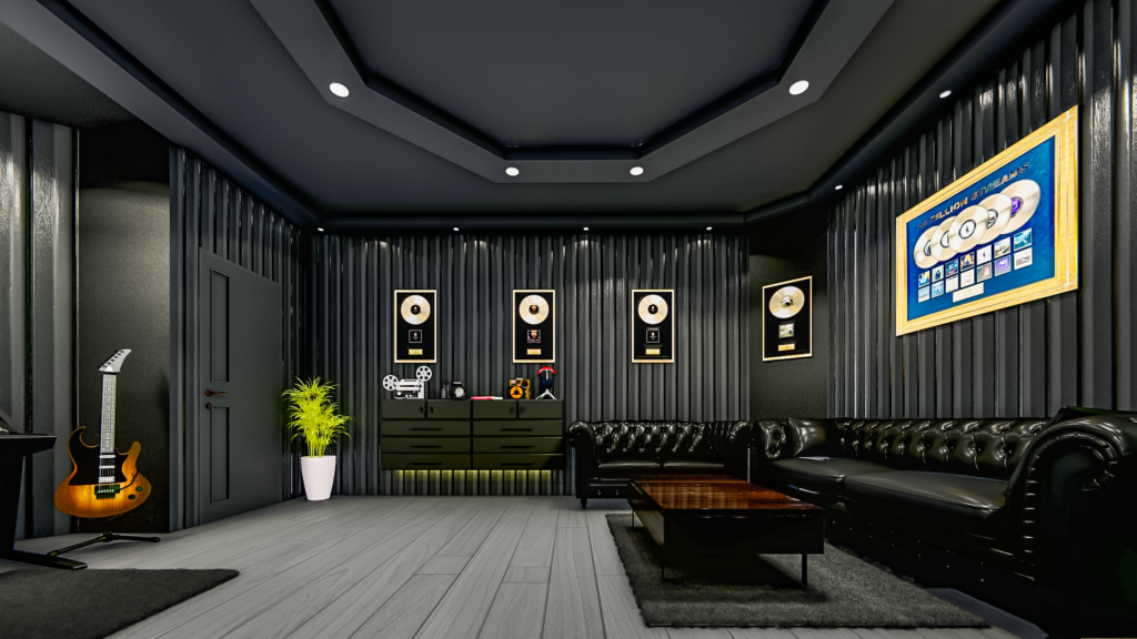 Dark aesthetics paired with smart spatial planning to enhance sound and creativity.