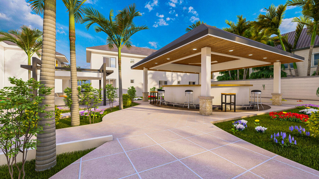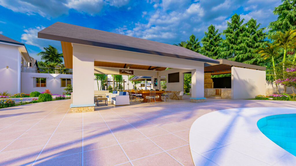 The exterior amenities of Ring Residence are thoughtfully designed to complement modern family living while fostering relaxation and social interaction. A sparkling swimming pool provides a central leisure spot, while nearby apartments create a sense of community within the compound. The outdoor dining area encourages gatherings and entertaining, blending seamlessly with landscaped surroundings. Every element balances elegance, functionality, and comfort, creating an inviting and luxurious outdoor environment.